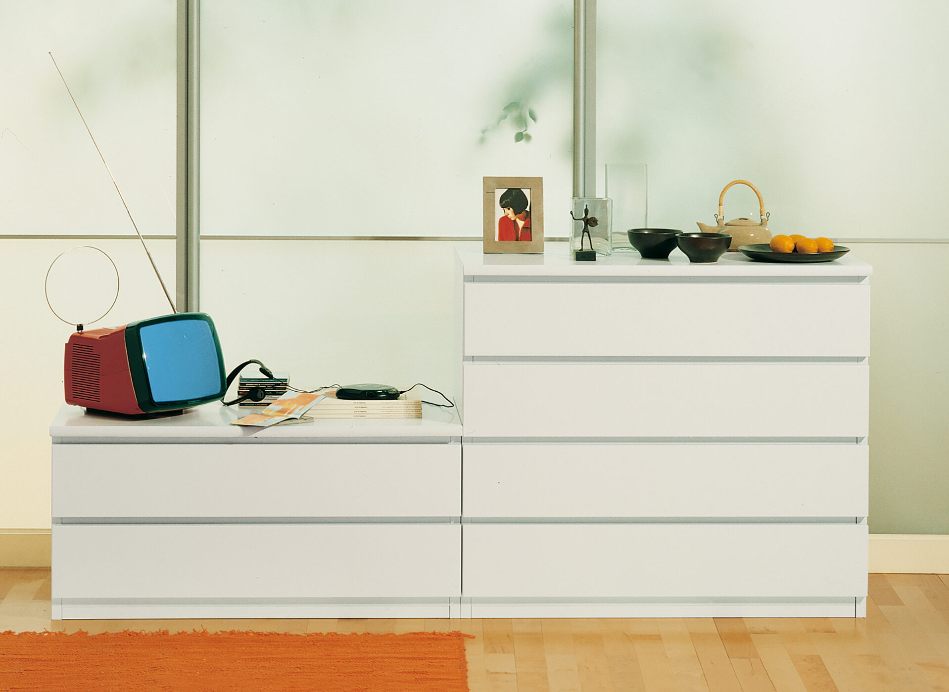 Quello che vi immaginiate per un comò o un comodino, lo potete fare con la linea Elba. A disposizione avete da 2 a 6 cassetti in altezza (da 47,5 cm a 115 cm) e diverse lunghezze dei cassetti fino a 86 cm (in questo caso il comò si divide in due cassetti). Le linee sono pulite e funzionali, possono essere aggiunti anche piedini oppure ruote. Il meccanismo di chiusura dei cassetti è ammortizzato e la realizzazione è in legno tamburato impiallacciato in ciliegio, noce o frassino oppure laccato (liscio o a poro aperto) in 15 colori. Troverete senz’altro il comò che fa per voi!